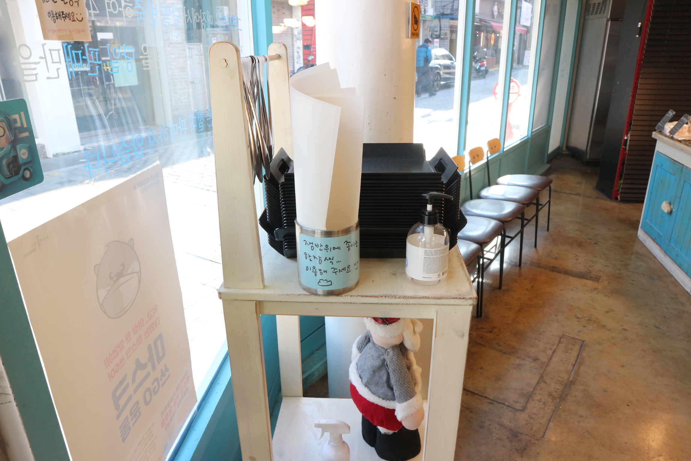 원래 여기에 작은 테이블 두개가 있었는데 코로나 매장에서 취식이 불가능해져서 때문에 이렇게 의자들만 있다.