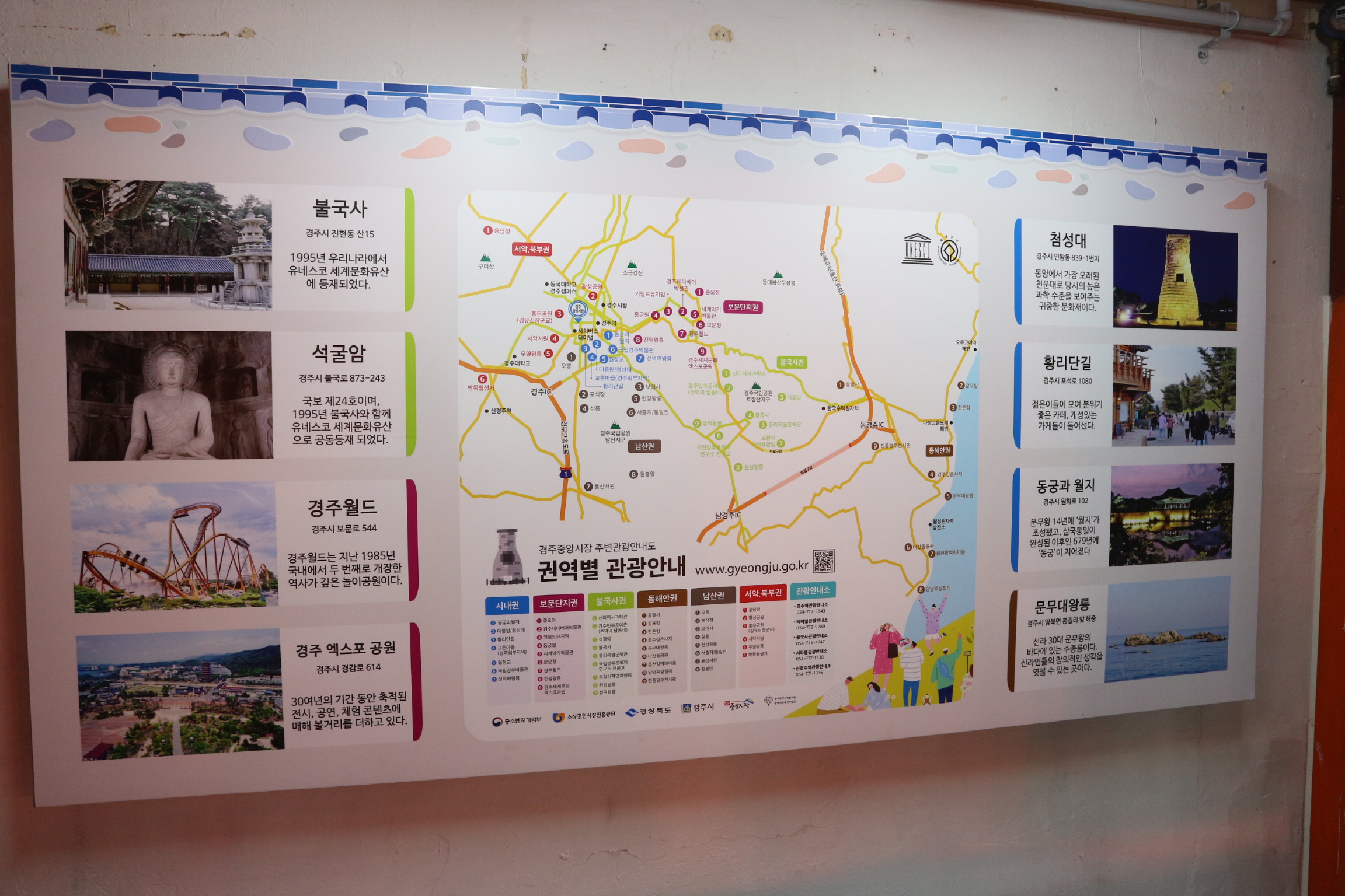 경주 관광지를 추천해주는 지도가 벽면에 크게 붙어있다.