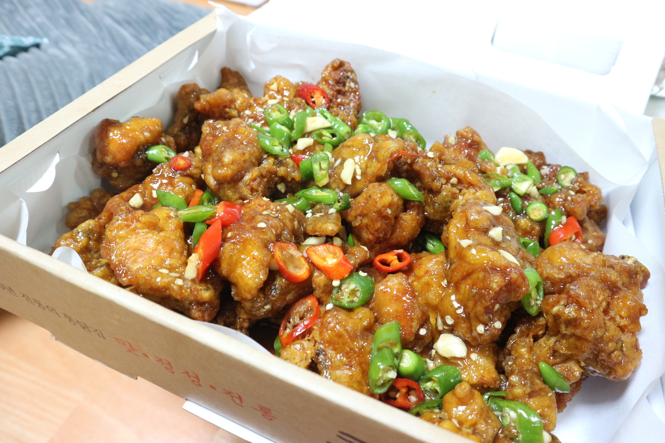 영롱한 땡초간장치킨님이시다. 저기 사이사이에 있는 고추는 땡초라서 엄청 맵다고 하니 주의해서 먹길 바란다. 하지만 치킨은 생각보다 안 맵다. 대표 맵찔이인 나도 정말 아주 살짝 매콤해서 맛있게 먹었다. 아이들이랑 같이 먹어도 될 것 같은 매운 정도이다. 음... 김치 정도?