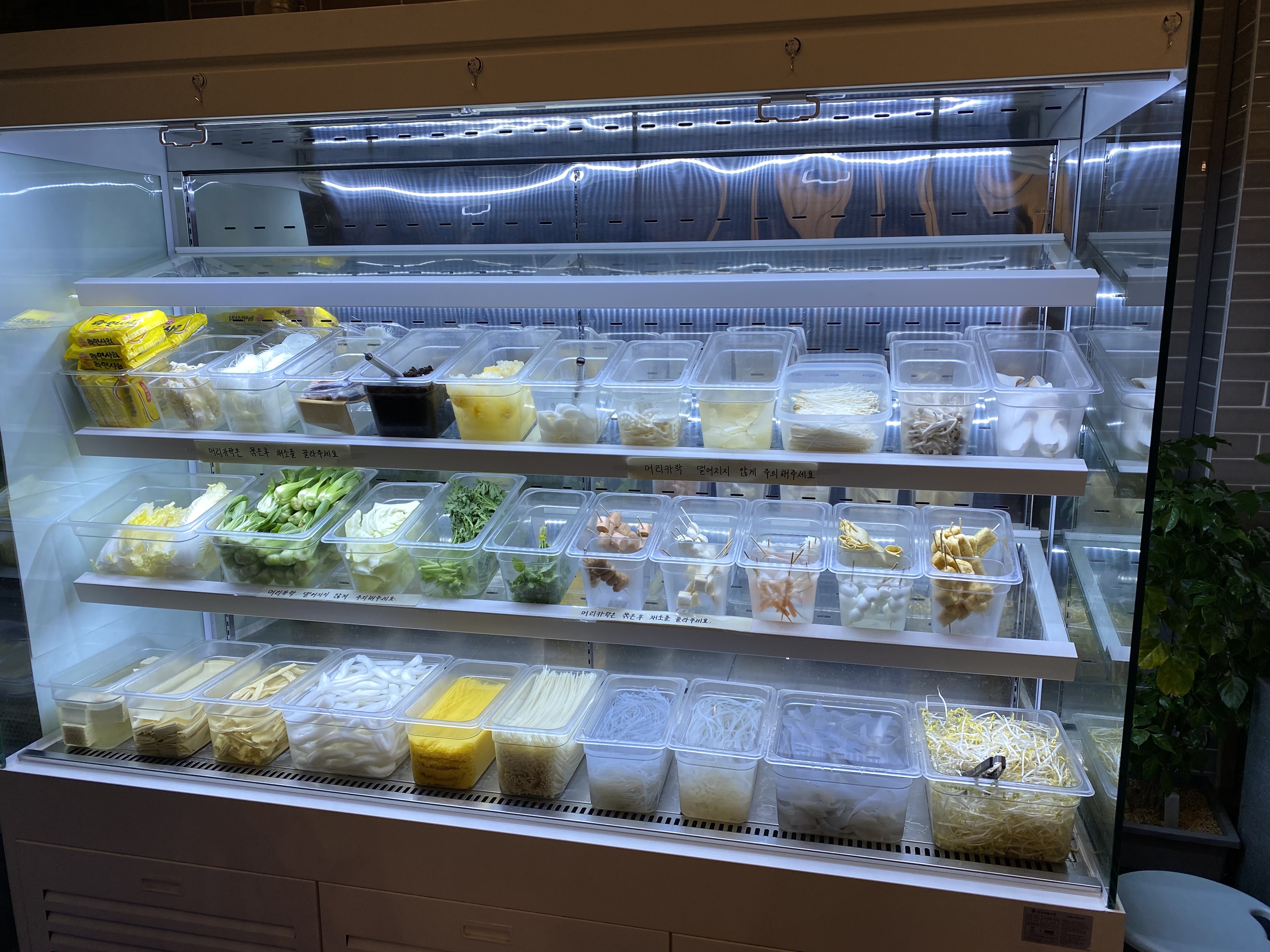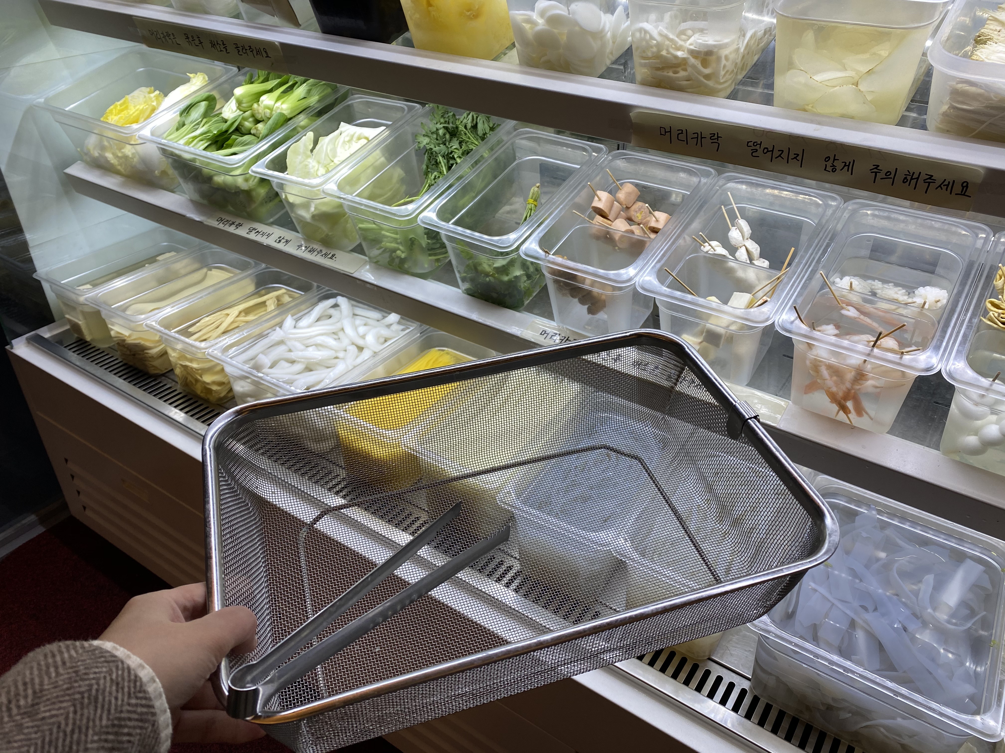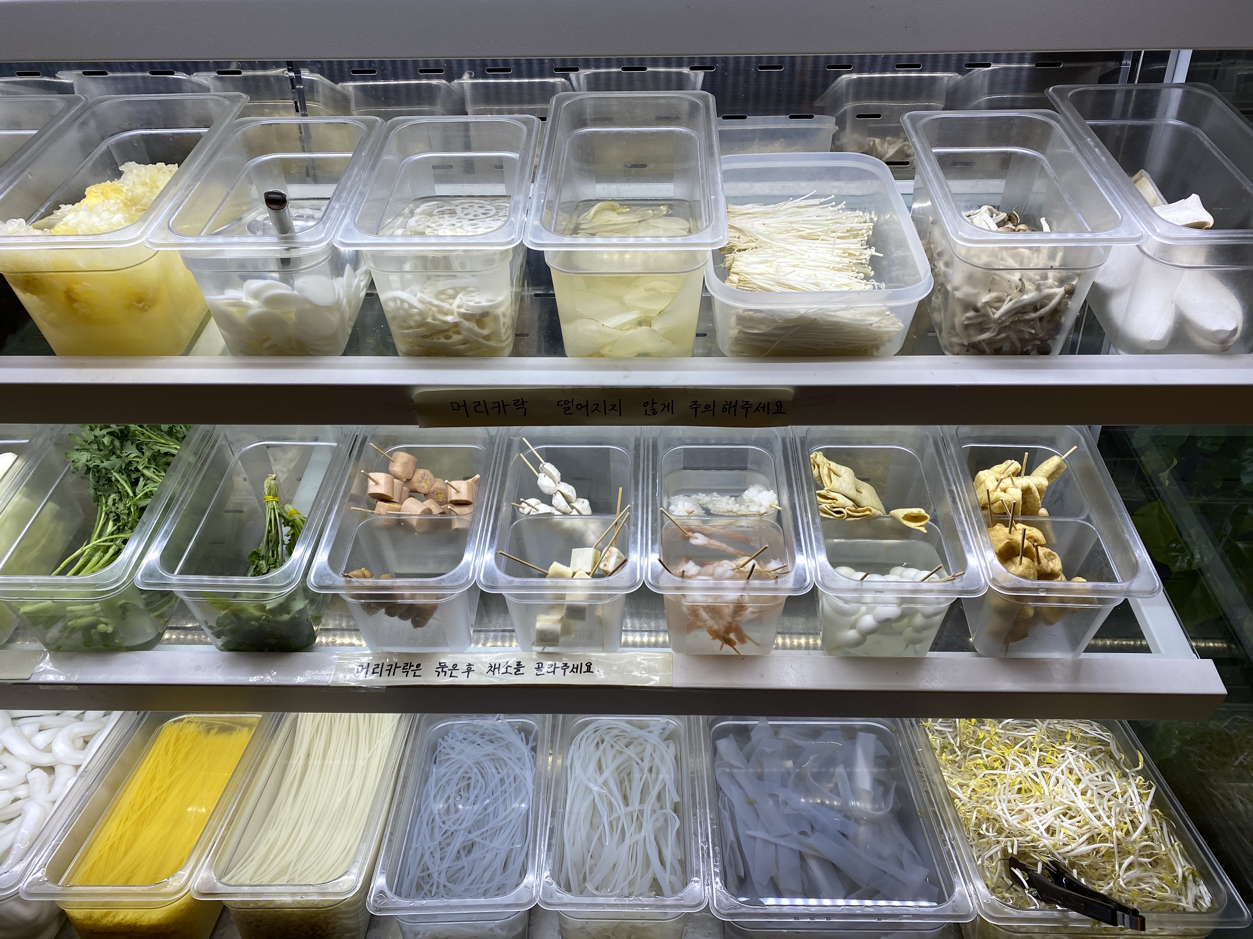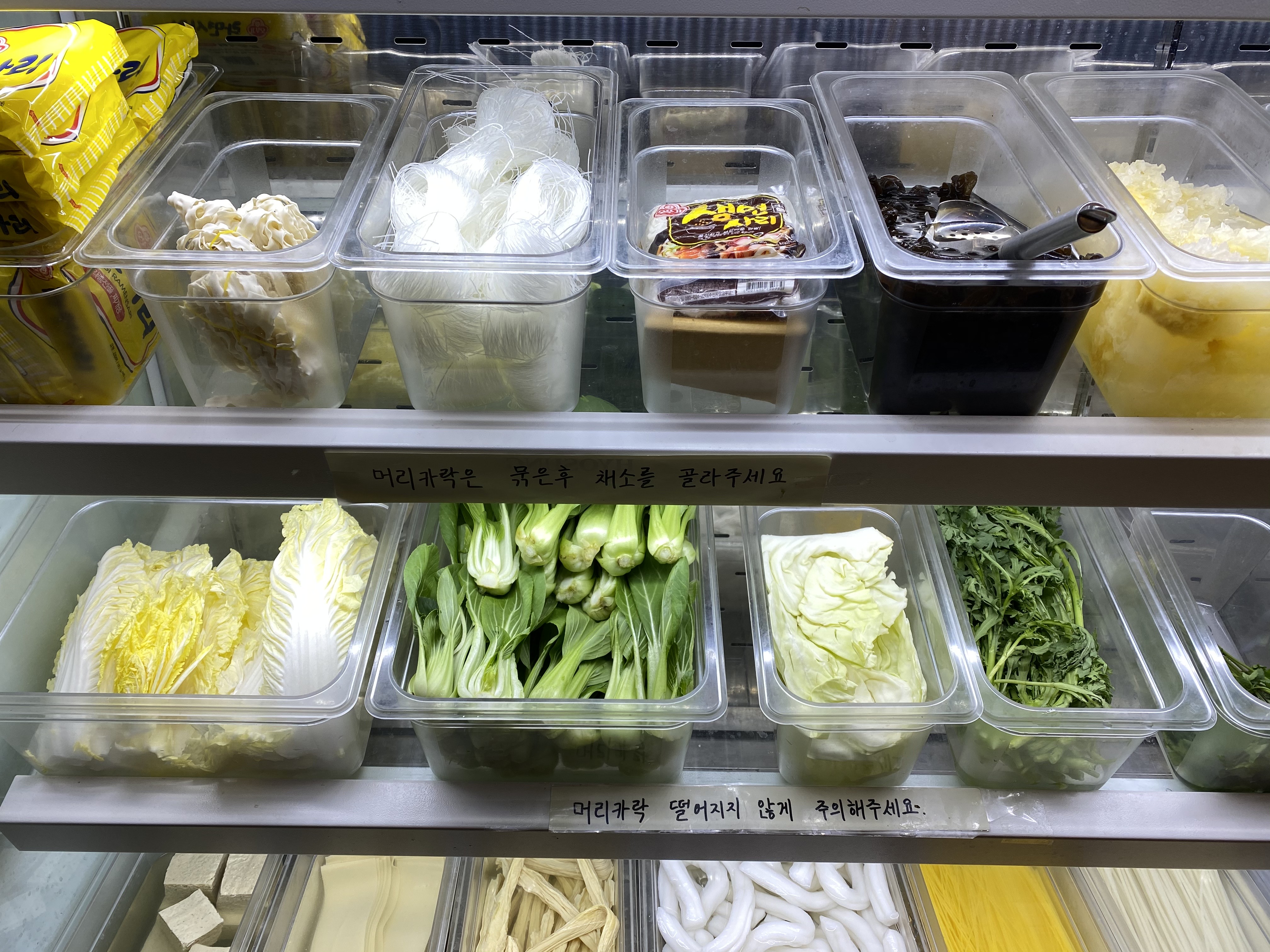 마라탕이랑 훠궈를 너무 좋아해서 맛있다고 하는 곳을 여기저기 찾아가 보는데 그때마다 아쉬운 건 식자재 보관상태이다. 물론 사람들이 많이 다녀가니 관리가 어려운 건 알고 있지만 음식이 담겨있는 물이 뿌옇게 변했거나... 통 옆에 무언가 떨어져 있거나 묻어있거나 더럽거나 한 곳이 엄청 많다. 너무 맛있지만 채소가 시들시들하고 먹으면 배탈 날것 같은 식자재들이라 소개를 못 해주는 곳도 꽤 있는데 일단 여기는 청결은 내가 여태 봐온 곳 중에서 최고인 것 같다. 보기에도 깔끔하게 담겨 있고, 사이사이 머리카락이 떨어질까 머리를 묶고 음식을 골라달라고 적혀있다. 이것만 봐도 주인분이 틈틈이 관리를 하시는 게 느껴졌다.