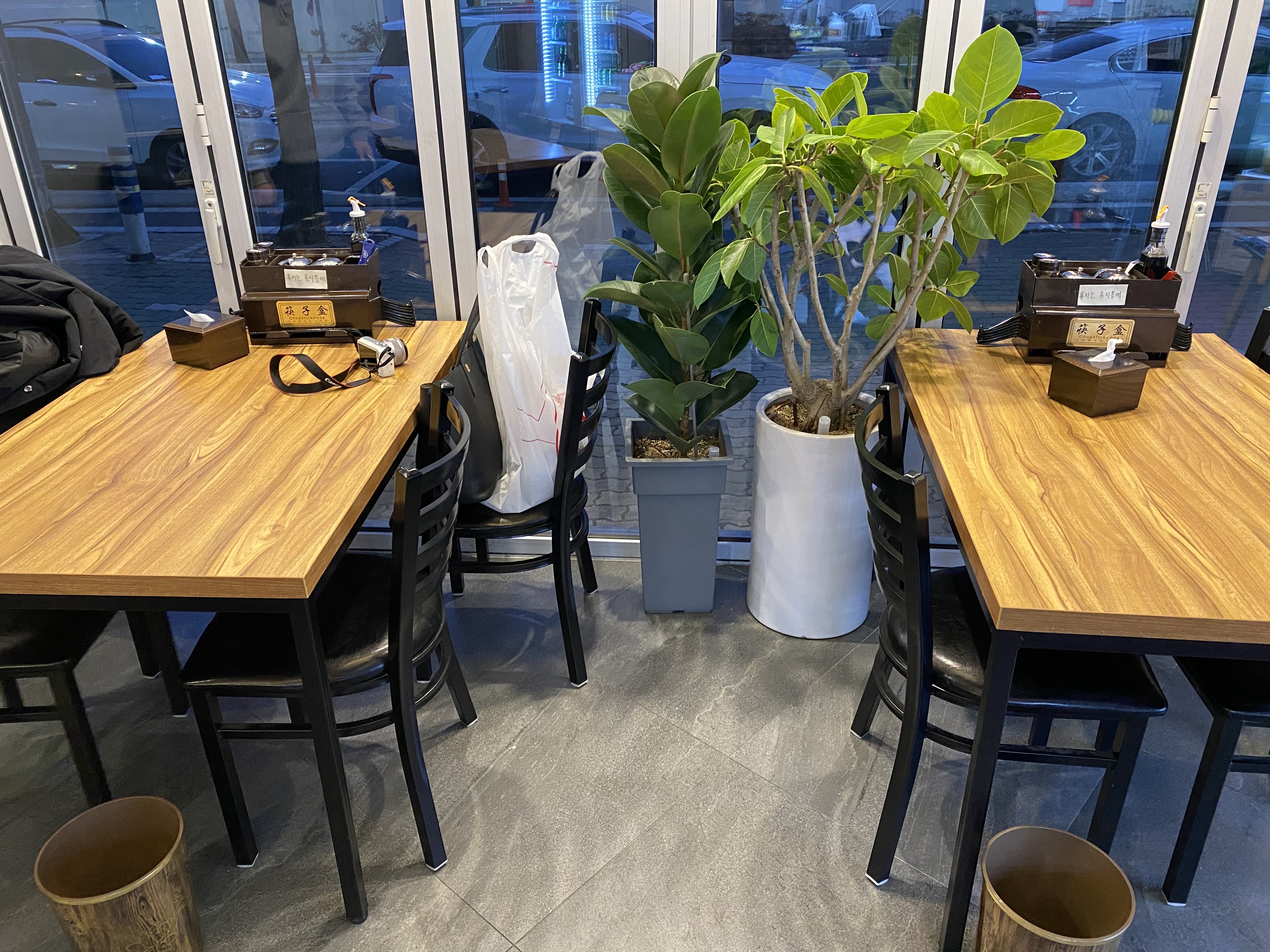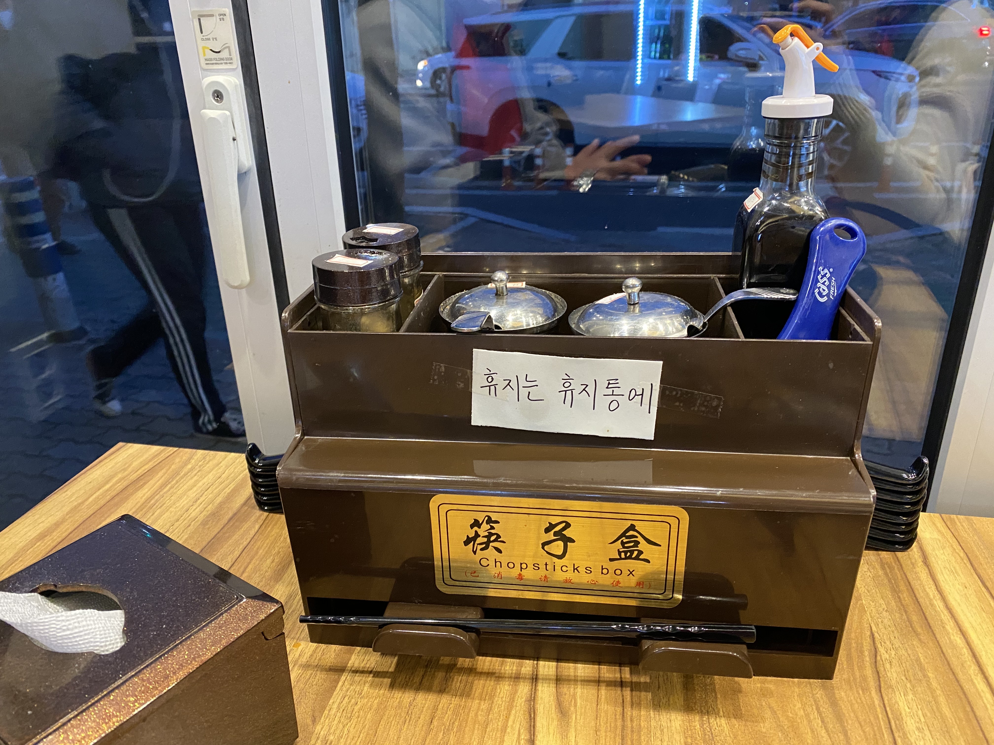 자리마다 이렇게 젓가락박스(?)가 있다. 맥도널드 빨대 뽑듯 꾹 누르면 젓가락이 나온다. 젓가락, 숟가락, 기본 조미료는 다 여기 있으니 각자의 기호에 맞게 먹으면 된다.